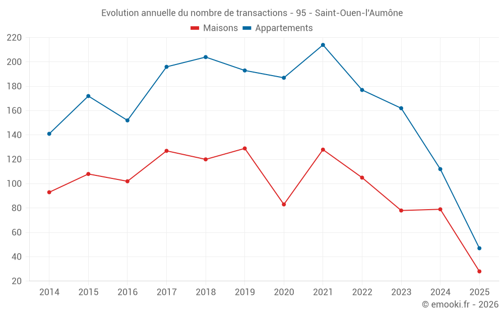 Le prix médian sur les 47 transactions d'appartements des 6 derniers mois dans la commune de Saint-Ouen-l'Aumône était de 3 067 € par mètre carré pour une valeur foncière médiane de 169 900 €. Sur cette période 60% des transactions se sont situées entre 2 110 et 3 740 € par mètre carré (du 2ème au 8ème déciles).