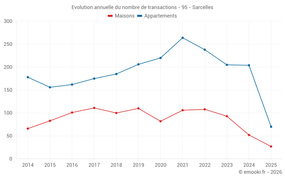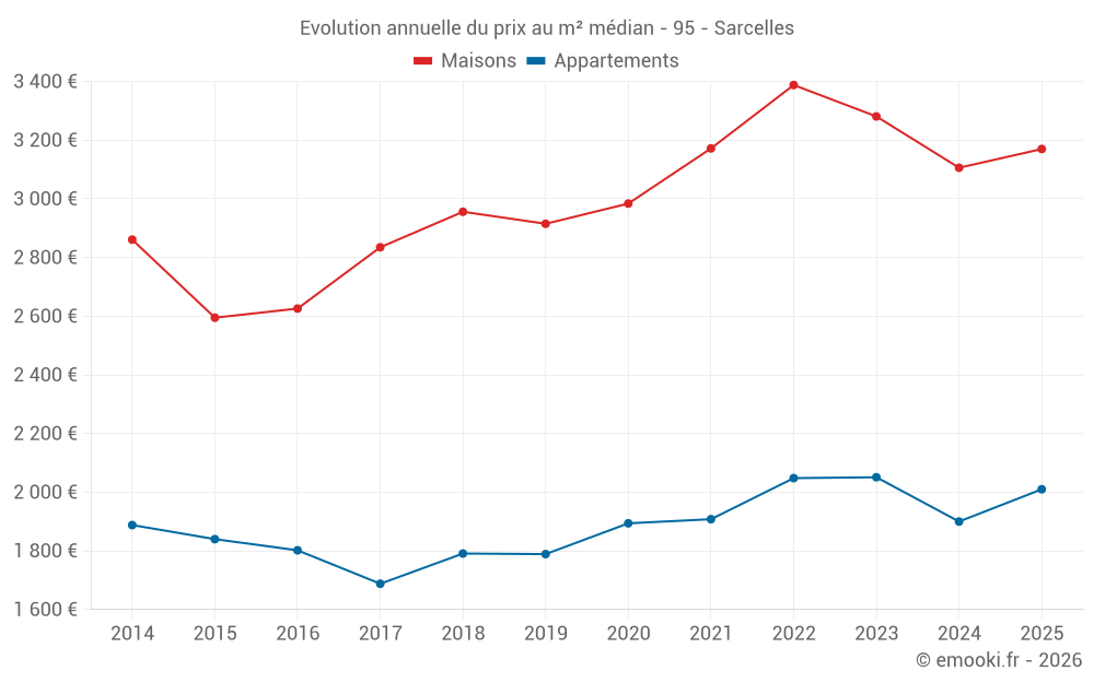 Le prix médian sur les 27 transactions de maisons des 6 derniers mois dans la commune de Sarcelles était de 3 170 € par mètre carré pour une valeur foncière médiane de 280 000 €. Sur cette période 60% des transactions se sont situées entre 2 547 et 3 873 € par mètre carré (du 2ème au 8ème déciles).