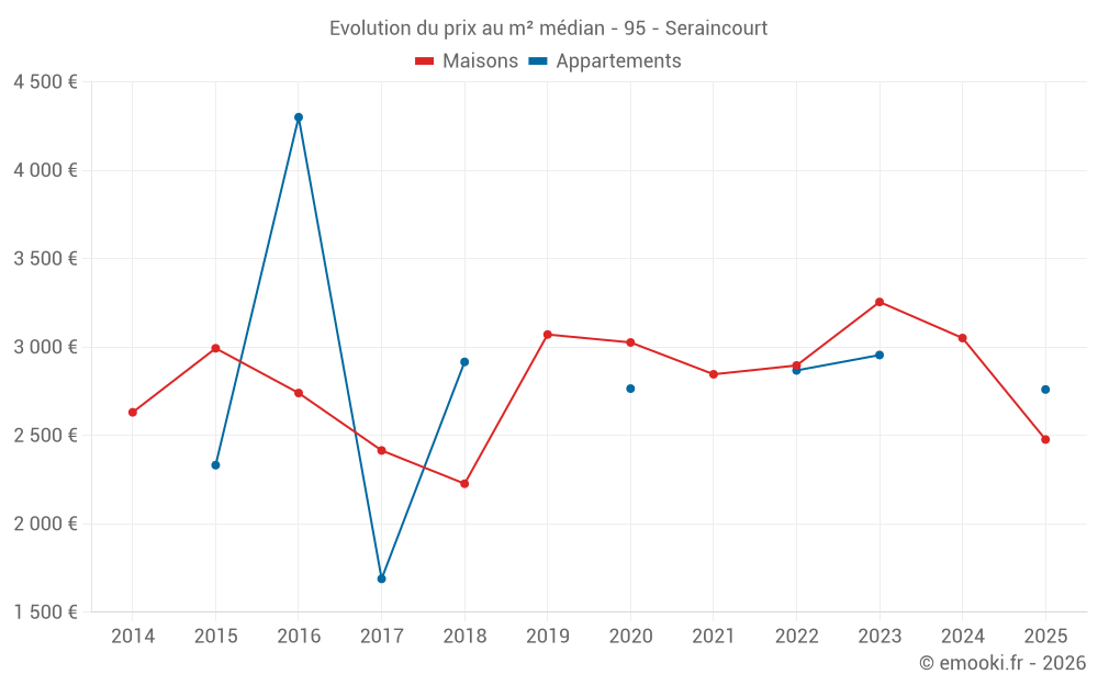 Le prix médian sur les 21 transactions de maisons des 24 derniers mois dans la commune de Seraincourt était de 2 917 € par mètre carré pour une valeur foncière médiane de 310 000 €. Sur cette période 60% des transactions se sont situées entre 2 095 et 3 882 € par mètre carré (du 2ème au 8ème déciles).