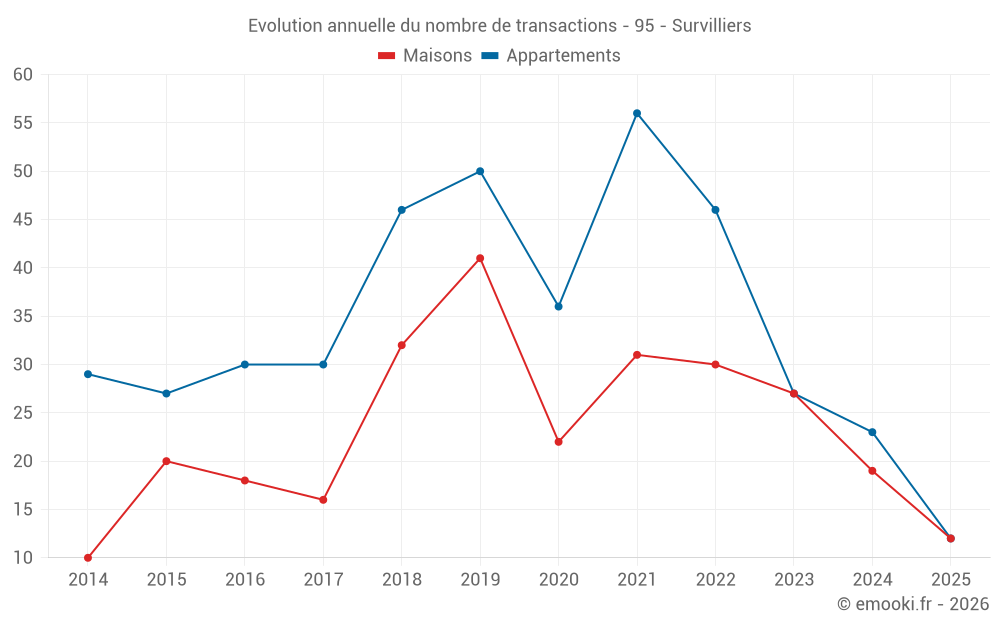Le prix médian sur les 23 transactions de maisons des 12 derniers mois dans la commune de Survilliers était de 2 634 € par mètre carré pour une valeur foncière médiane de 225 000 €. Sur cette période 60% des transactions se sont situées entre 2 146 et 3 648 € par mètre carré (du 2ème au 8ème déciles).