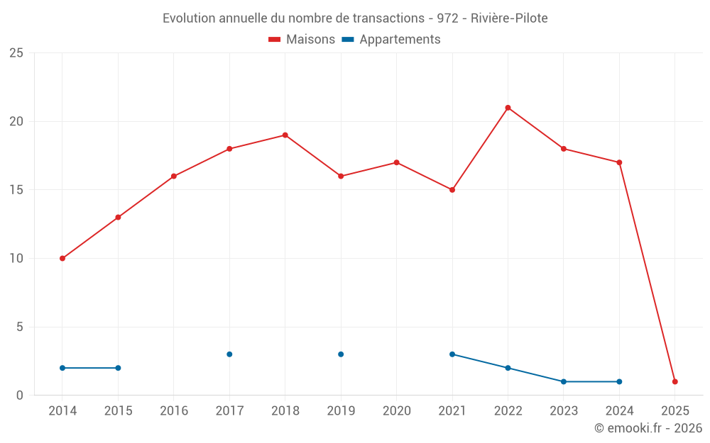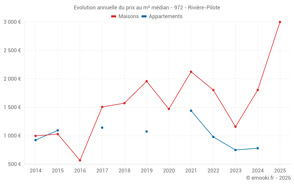 Le prix médian sur les 29 transactions de maisons des 24 derniers mois dans la commune de Rivière-Pilote était de 1 332 € par mètre carré pour une valeur foncière médiane de 154 000 €. Sur cette période 60% des transactions se sont situées entre 843 et 2 579 € par mètre carré (du 2ème au 8ème déciles).