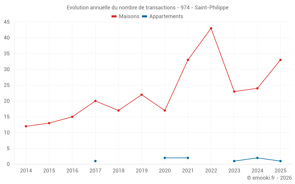 Le prix médian sur les 24 transactions de maisons des 6 derniers mois dans la commune de Saint-Philippe était de 1 862 € par mètre carré pour une valeur foncière médiane de 154 250 €. Sur cette période 60% des transactions se sont situées entre 1 162 et 2 489 € par mètre carré (du 2ème au 8ème déciles).
