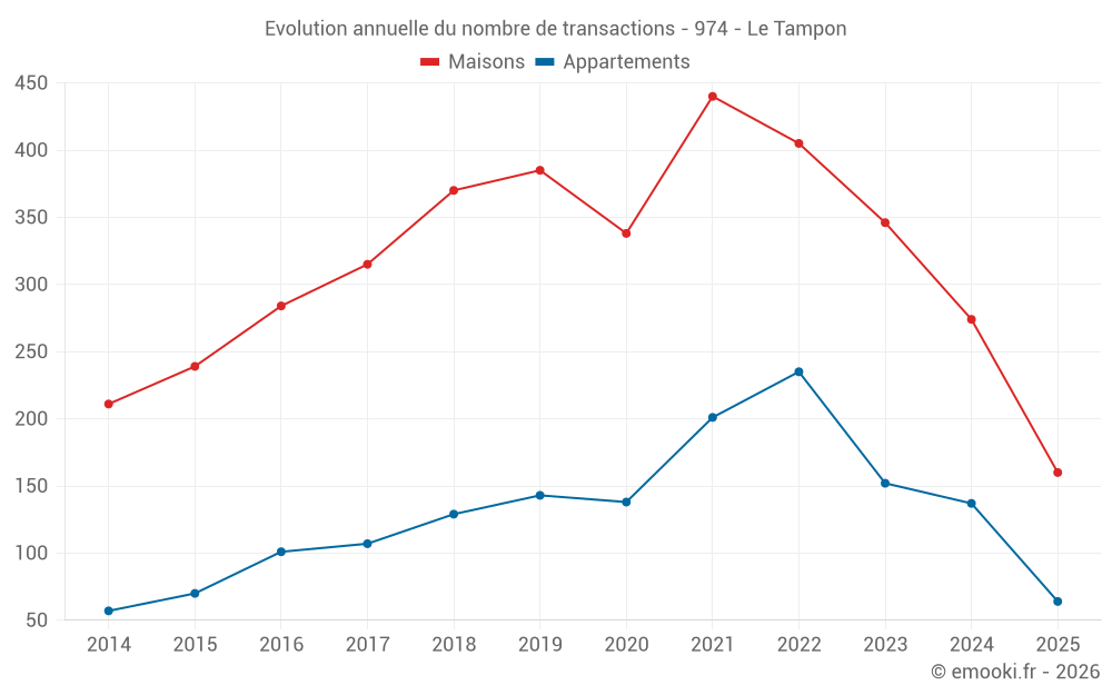 Le prix médian sur les 76 transactions de maisons des 3 derniers mois dans la commune du Tampon était de 2 428 € par mètre carré pour une valeur foncière médiane de 203 875 €. Sur cette période 60% des transactions se sont situées entre 1 825 et 3 070 € par mètre carré (du 2ème au 8ème déciles).