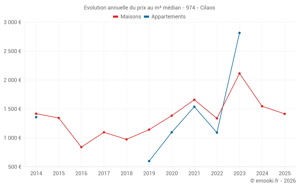 Le prix médian sur les 25 transactions de maisons des 12 derniers mois dans la commune de Cilaos était de 1 320 € par mètre carré pour une valeur foncière médiane de 79 900 €. Sur cette période 60% des transactions se sont situées entre 284 et 2 461 € par mètre carré (du 2ème au 8ème déciles).