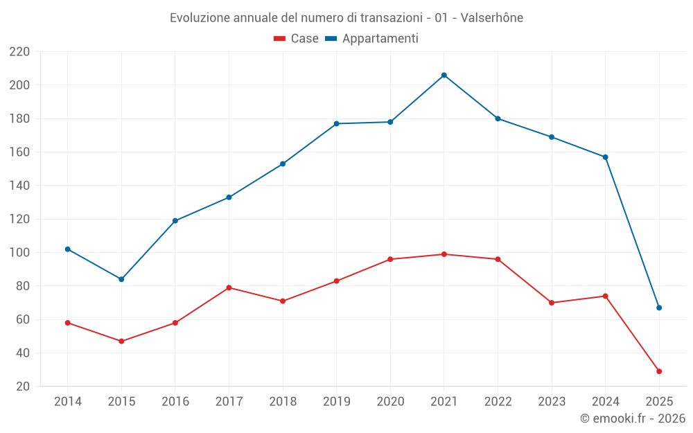 Il prezzo mediano sulle 29 transazioni di case degli ultimi 6 mesi nel comune di Valserhône era di 3 125 € al metro quadrato per un valore patrimoniale mediano di 327 663 €. In questo periodo il 60% delle transazioni era tra 2 473 e 3 649 € al metro quadrato (dal 2° all'8° decile).