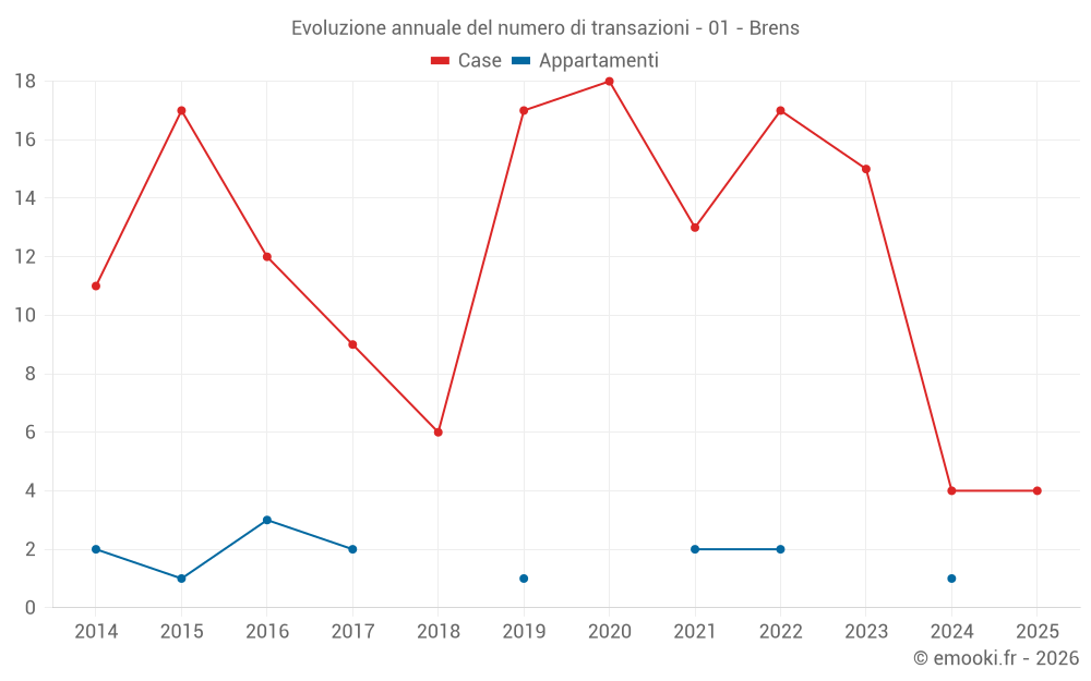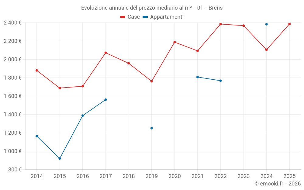 Il prezzo mediano sulle 15 transazioni di case degli ultimi 24 mesi nel comune di Brens era di 2 143 € al metro quadrato per un valore patrimoniale mediano di 310 000 €. In questo periodo il 60% delle transazioni era tra 1 276 e 2 862 € al metro quadrato (dal 2° all'8° decile).