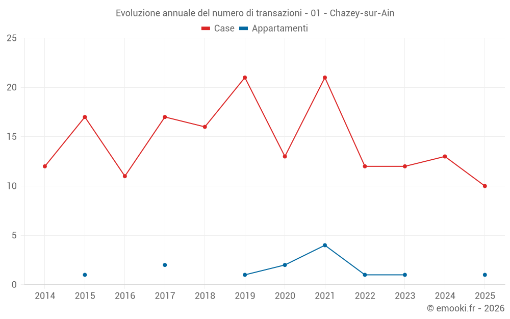 Il prezzo mediano sulle 18 transazioni di case degli ultimi 12 mesi nel comune di Chazey-sur-Ain era di 2 676 € al metro quadrato per un valore patrimoniale mediano di 294 500 €. In questo periodo il 60% delle transazioni era tra 1 575 e 3 368 € al metro quadrato (dal 2° all'8° decile).
