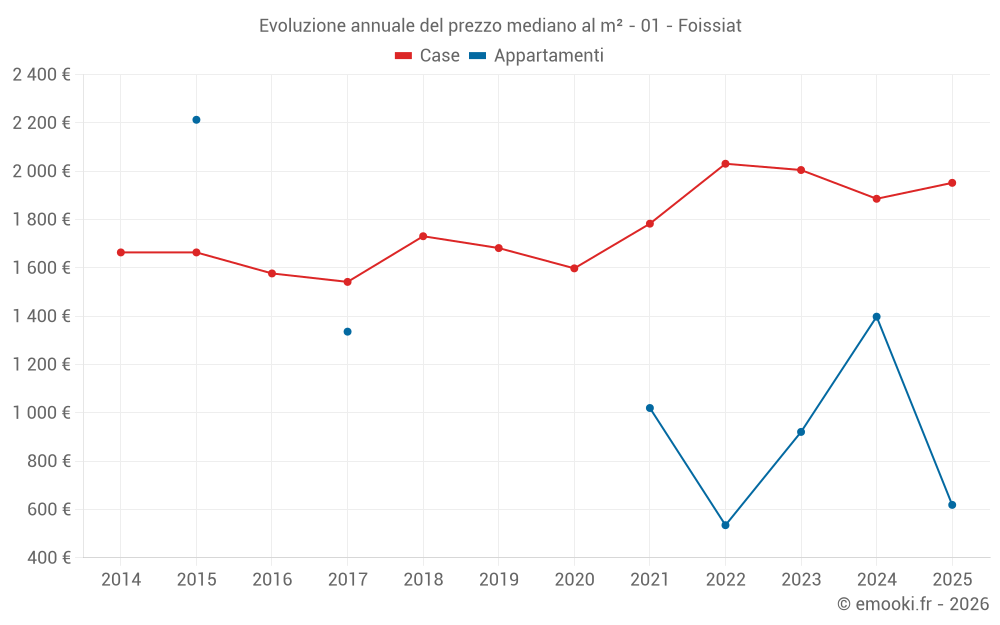 Il prezzo mediano sulle 26 transazioni di case degli ultimi 12 mesi nel comune di Foissiat era di 1 960 € al metro quadrato per un valore patrimoniale mediano di 202 000 €. In questo periodo il 60% delle transazioni era tra 1 138 e 2 417 € al metro quadrato (dal 2° all'8° decile).