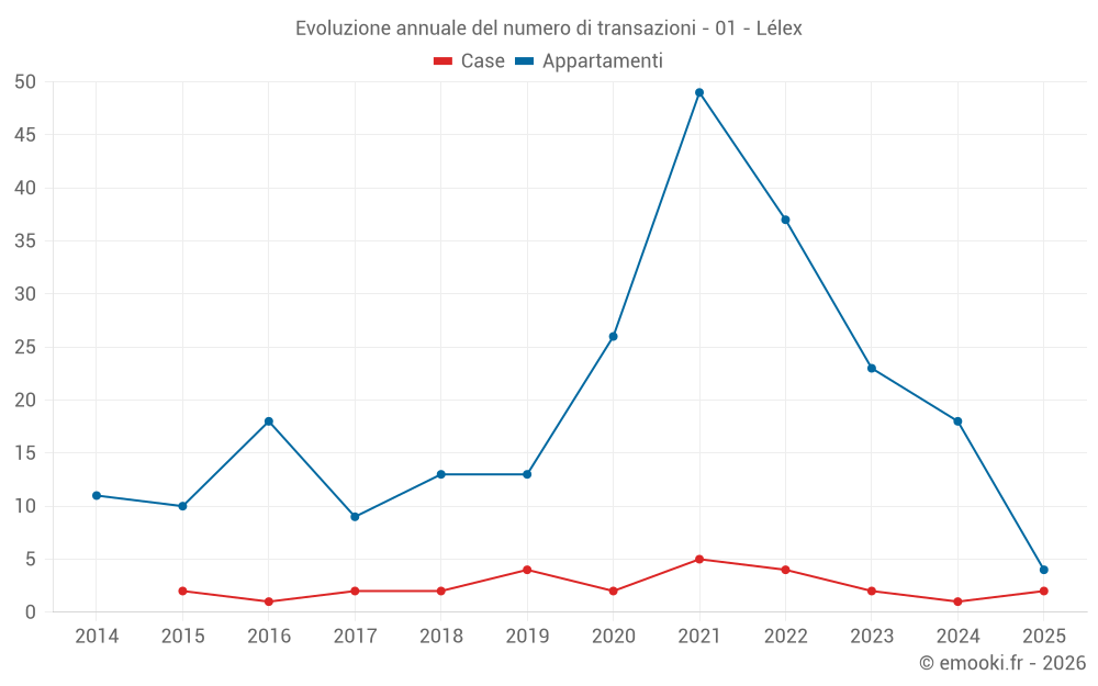 Il prezzo mediano sulle 32 transazioni di appartamenti degli ultimi 24 mesi nel comune di Lélex era di 2 326 € al metro quadrato per un valore patrimoniale mediano di 70 250 €. In questo periodo il 60% delle transazioni era tra 1 956 e 2 656 € al metro quadrato (dal 2° all'8° decile).