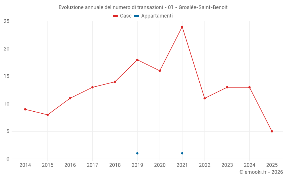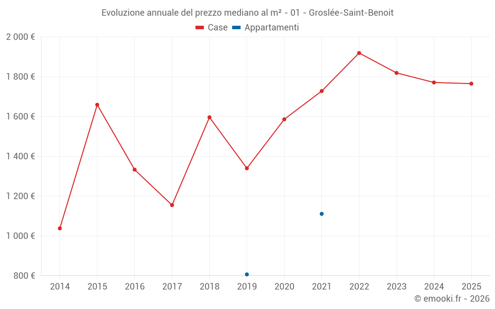 Il prezzo mediano sulle 22 transazioni di case degli ultimi 24 mesi nel comune di Groslée-Saint-Benoit era di 1 768 € al metro quadrato per un valore patrimoniale mediano di 208 350 €. In questo periodo il 60% delle transazioni era tra 1 327 e 2 402 € al metro quadrato (dal 2° all'8° decile).