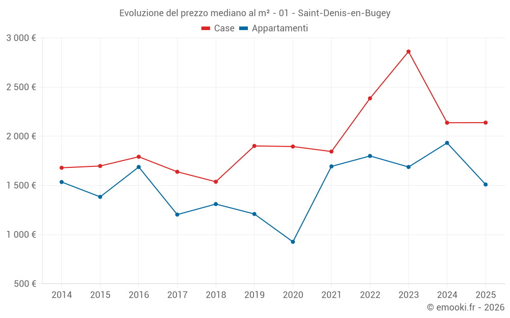 Il prezzo mediano sulle 23 transazioni di case degli ultimi 12 mesi nel comune di Saint-Denis-en-Bugey era di 2 138 € al metro quadrato per un valore patrimoniale mediano di 175 000 €. In questo periodo il 60% delle transazioni era tra 1 361 e 2 694 € al metro quadrato (dal 2° all'8° decile).