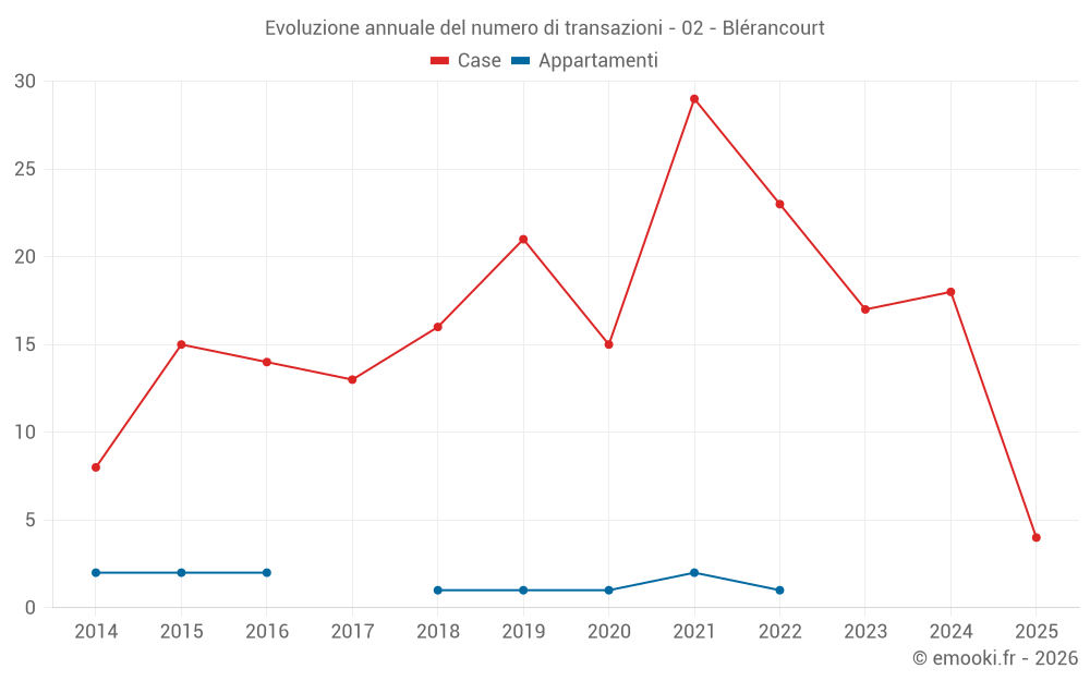 Il prezzo mediano sulle 16 transazioni di case degli ultimi 12 mesi nel comune di Blérancourt era di 1 050 € al metro quadrato per un valore patrimoniale mediano di 124 000 €. In questo periodo il 60% delle transazioni era tra 851 e 1 454 € al metro quadrato (dal 2° all'8° decile).
