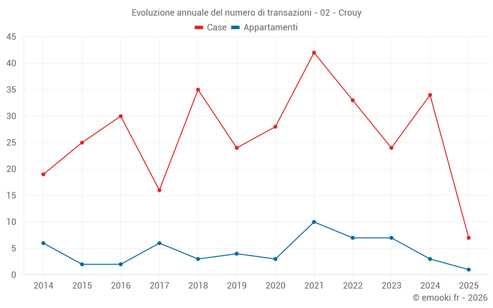 Il prezzo mediano sulle 27 transazioni di case degli ultimi 12 mesi nel comune di Crouy era di 1 680 € al metro quadrato per un valore patrimoniale mediano di 127 000 €. In questo periodo il 60% delle transazioni era tra 1 265 e 1 960 € al metro quadrato (dal 2° all'8° decile).
