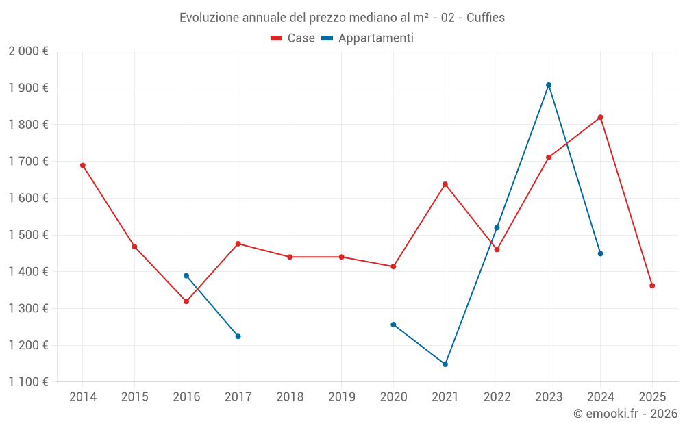 Il prezzo mediano sulle 17 transazioni di case degli ultimi 12 mesi nel comune di Cuffies era di 1 720 € al metro quadrato per un valore patrimoniale mediano di 130 750 €. In questo periodo il 60% delle transazioni era tra 1 100 e 2 016 € al metro quadrato (dal 2° all'8° decile).