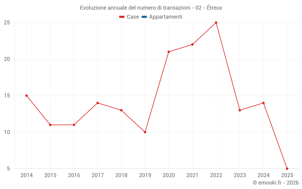 Il prezzo mediano sulle 24 transazioni di case degli ultimi 24 mesi nel comune di Étreux era di 812 € al metro quadrato per un valore patrimoniale mediano di 70 000 €. In questo periodo il 60% delle transazioni era tra 644 e 1 107 € al metro quadrato (dal 2° all'8° decile).
