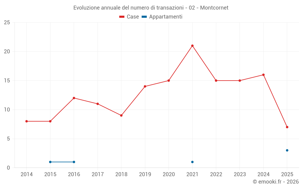 Il prezzo mediano sulle 32 transazioni di case degli ultimi 24 mesi nel comune di Montcornet era di 882 € al metro quadrato per un valore patrimoniale mediano di 72 500 €. In questo periodo il 60% delle transazioni era tra 682 e 1 441 € al metro quadrato (dal 2° all'8° decile).
