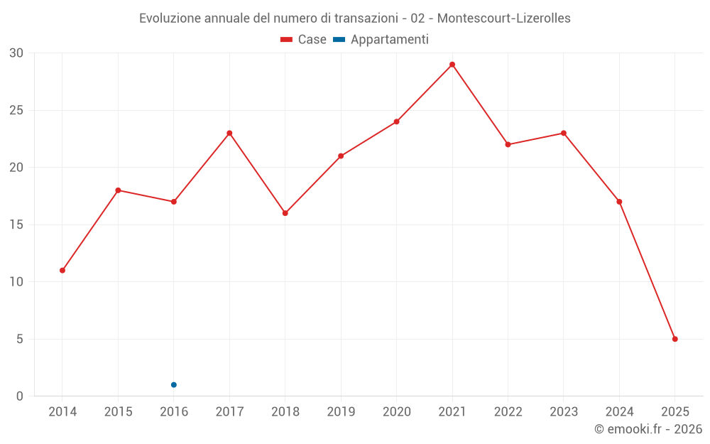 Il prezzo mediano sulle 16 transazioni di case degli ultimi 12 mesi nel comune di Montescourt-Lizerolles era di 1 352 € al metro quadrato per un valore patrimoniale mediano di 125 050 €. In questo periodo il 60% delle transazioni era tra 1 014 e 1 681 € al metro quadrato (dal 2° all'8° decile).
