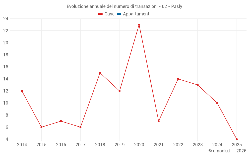 Il prezzo mediano sulle 23 transazioni di case degli ultimi 24 mesi nel comune di Pasly era di 1 796 € al metro quadrato per un valore patrimoniale mediano di 178 000 €. In questo periodo il 60% delle transazioni era tra 1 400 e 2 039 € al metro quadrato (dal 2° all'8° decile).