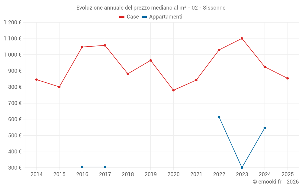 Il prezzo mediano sulle 16 transazioni di case degli ultimi 12 mesi nel comune di Sissonne era di 932 € al metro quadrato per un valore patrimoniale mediano di 104 875 €. In questo periodo il 60% delle transazioni era tra 645 e 1 154 € al metro quadrato (dal 2° all'8° decile).