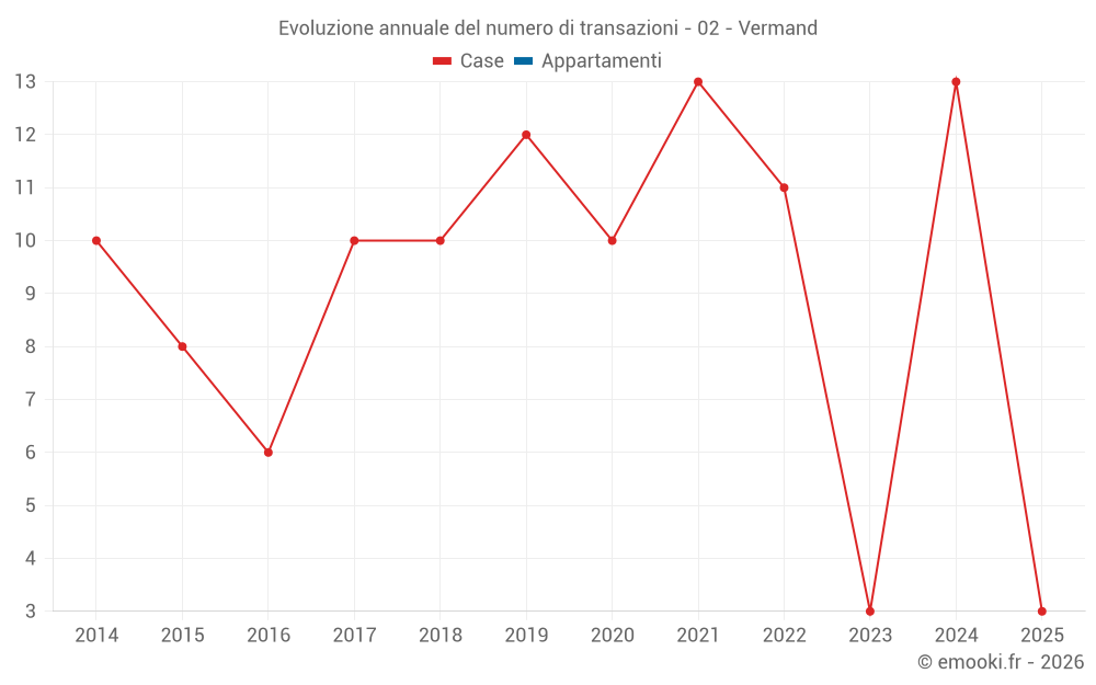 Il prezzo mediano sulle 17 transazioni di case degli ultimi 24 mesi nel comune di Vermand era di 1 143 € al metro quadrato per un valore patrimoniale mediano di 87 000 €. In questo periodo il 60% delle transazioni era tra 799 e 1 312 € al metro quadrato (dal 2° all'8° decile).