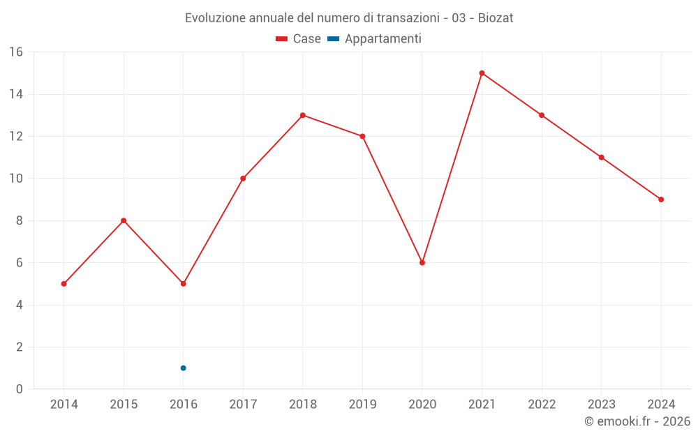 Il prezzo mediano sulle 17 transazioni di case degli ultimi 24 mesi nel comune di Biozat era di 1 558 € al metro quadrato per un valore patrimoniale mediano di 120 050 €. In questo periodo il 60% delle transazioni era tra 725 e 1 907 € al metro quadrato (dal 2° all'8° decile).