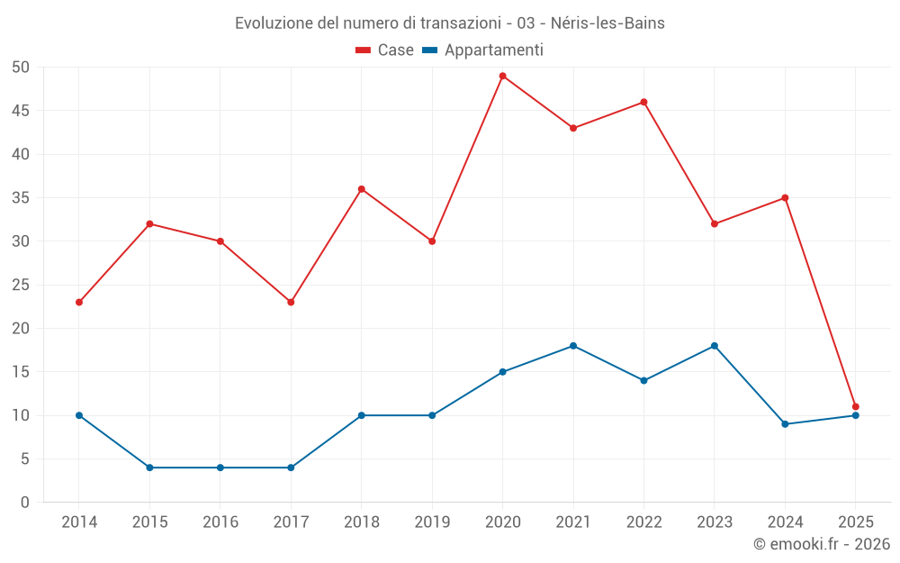 Il prezzo mediano sulle 30 transazioni di case degli ultimi 12 mesi nel comune di Néris-les-Bains era di 1 108 € al metro quadrato per un valore patrimoniale mediano di 92 750 €. In questo periodo il 60% delle transazioni era tra 835 e 1 485 € al metro quadrato (dal 2° all'8° decile).
