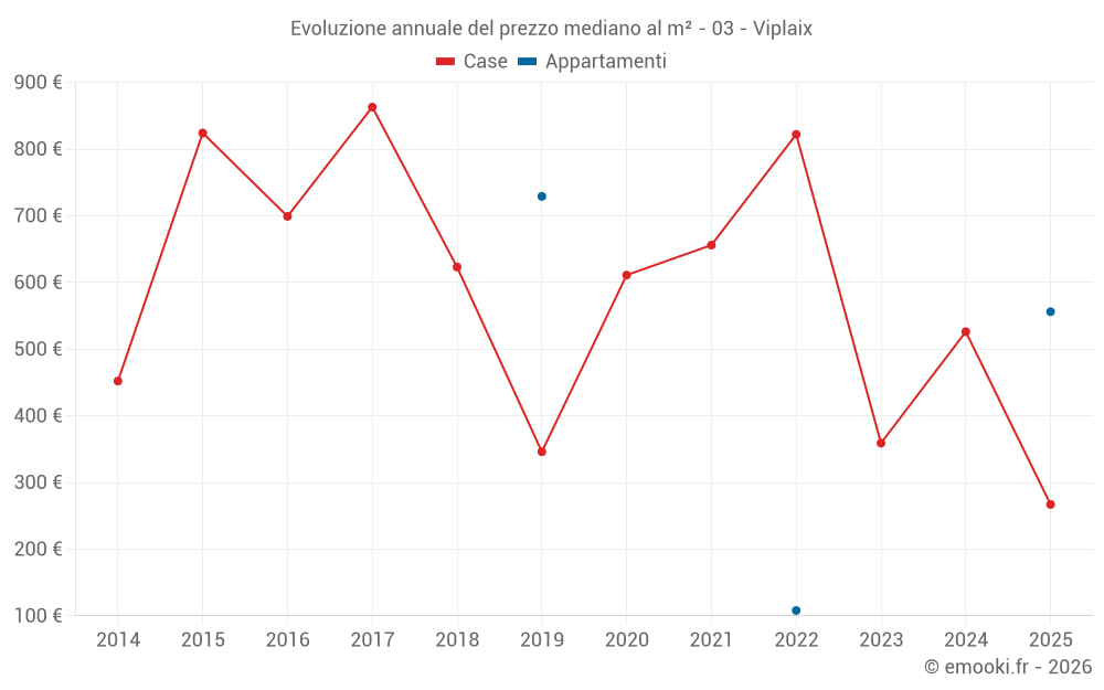 Il prezzo mediano sulle 17 transazioni di case degli ultimi 24 mesi nel comune di Viplaix era di 516 € al metro quadrato per un valore patrimoniale mediano di 40 000 €. In questo periodo il 60% delle transazioni era tra 241 e 764 € al metro quadrato (dal 2° all'8° decile).