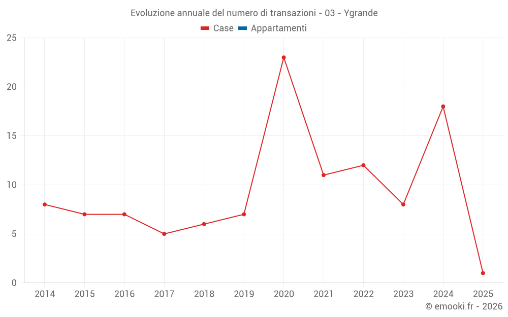 Il prezzo mediano sulle 25 transazioni di case degli ultimi 24 mesi nel comune di Ygrande era di 914 € al metro quadrato per un valore patrimoniale mediano di 79 250 €. In questo periodo il 60% delle transazioni era tra 277 e 1 729 € al metro quadrato (dal 2° all'8° decile).