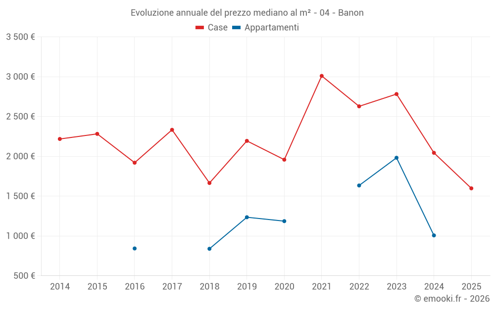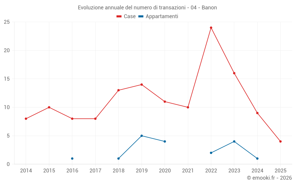 Il prezzo mediano sulle 23 transazioni di case degli ultimi 24 mesi nel comune di Banon era di 2 256 € al metro quadrato per un valore patrimoniale mediano di 161 000 €. In questo periodo il 60% delle transazioni era tra 1 075 e 2 917 € al metro quadrato (dal 2° all'8° decile).