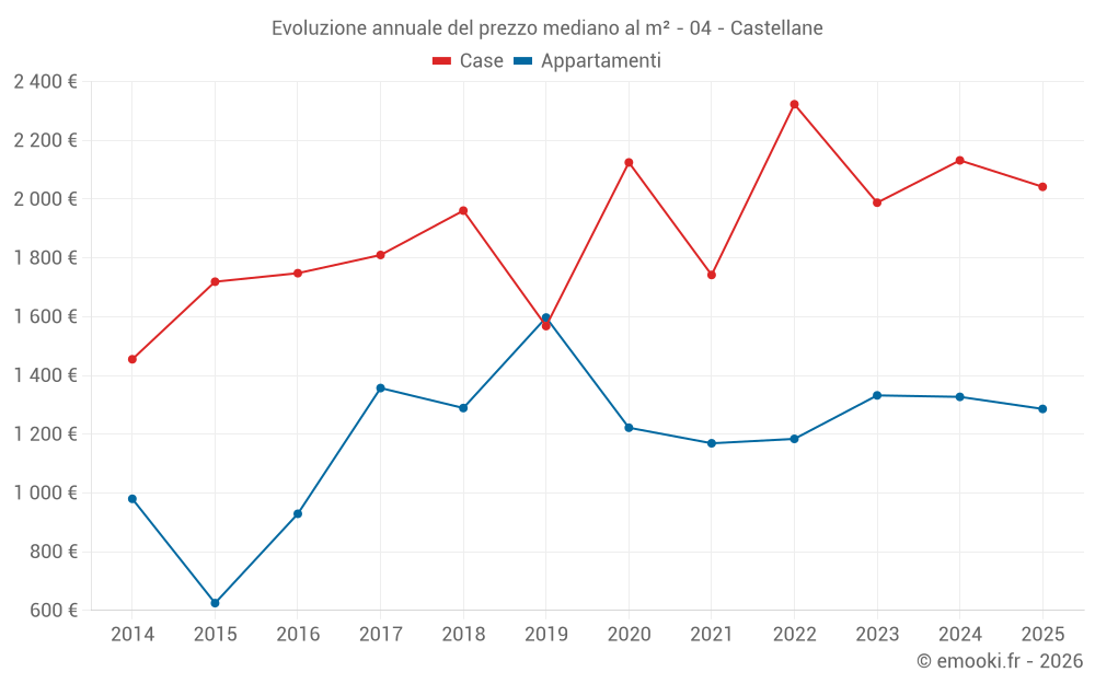 Il prezzo mediano sulle 16 transazioni di case degli ultimi 12 mesi nel comune di Castellane era di 2 058 € al metro quadrato per un valore patrimoniale mediano di 140 000 €. In questo periodo il 60% delle transazioni era tra 1 472 e 2 616 € al metro quadrato (dal 2° all'8° decile).