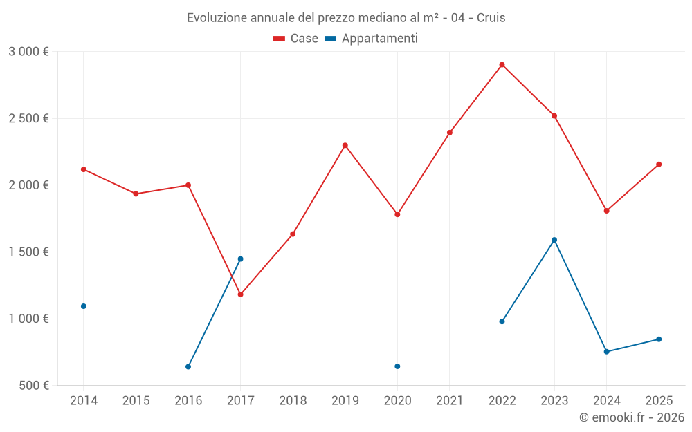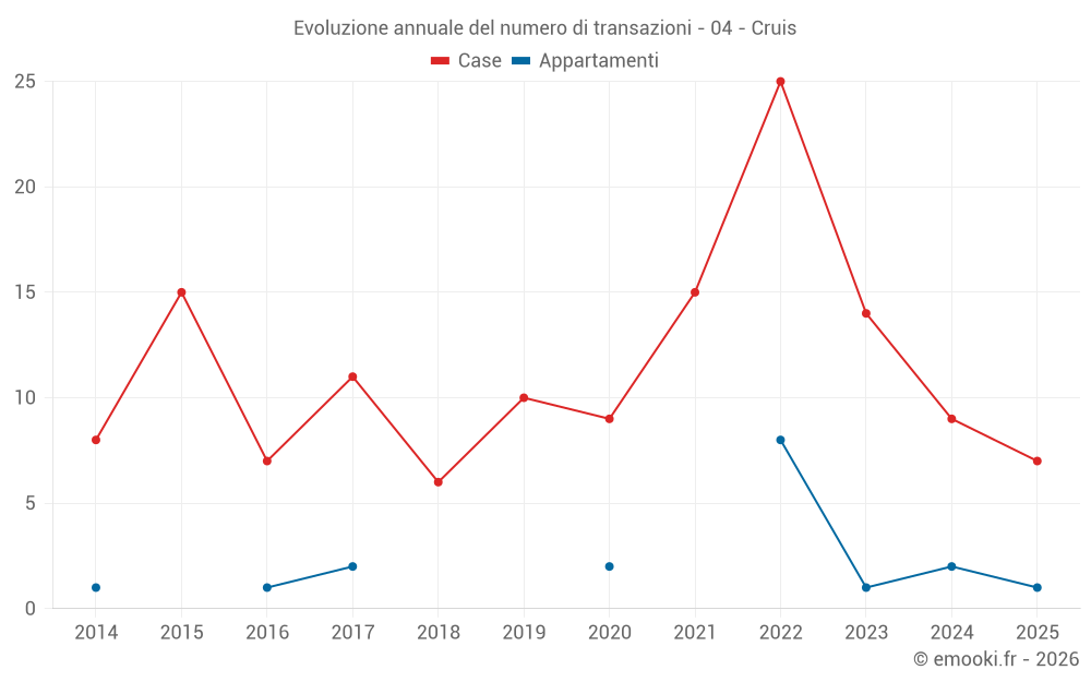 Il prezzo mediano sulle 27 transazioni di case degli ultimi 24 mesi nel comune di Cruis era di 1 983 € al metro quadrato per un valore patrimoniale mediano di 155 000 €. In questo periodo il 60% delle transazioni era tra 1 248 e 3 054 € al metro quadrato (dal 2° all'8° decile).