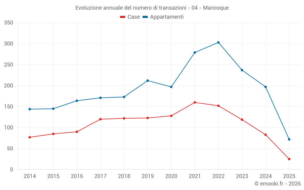 Il prezzo mediano sulle 25 transazioni di case degli ultimi 6 mesi nel comune di Manosque era di 2 804 € al metro quadrato per un valore patrimoniale mediano di 256 670 €. In questo periodo il 60% delle transazioni era tra 2 277 e 3 165 € al metro quadrato (dal 2° all'8° decile).
