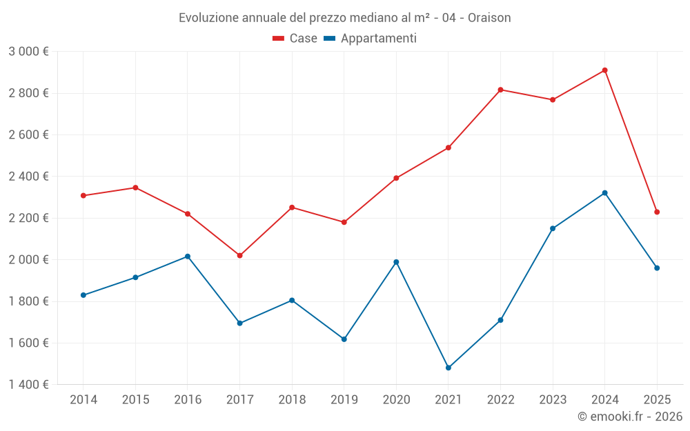 Il prezzo mediano sulle 48 transazioni di case degli ultimi 12 mesi nel comune di Oraison era di 2 628 € al metro quadrato per un valore patrimoniale mediano di 262 500 €. In questo periodo il 60% delle transazioni era tra 1 830 e 3 530 € al metro quadrato (dal 2° all'8° decile).
