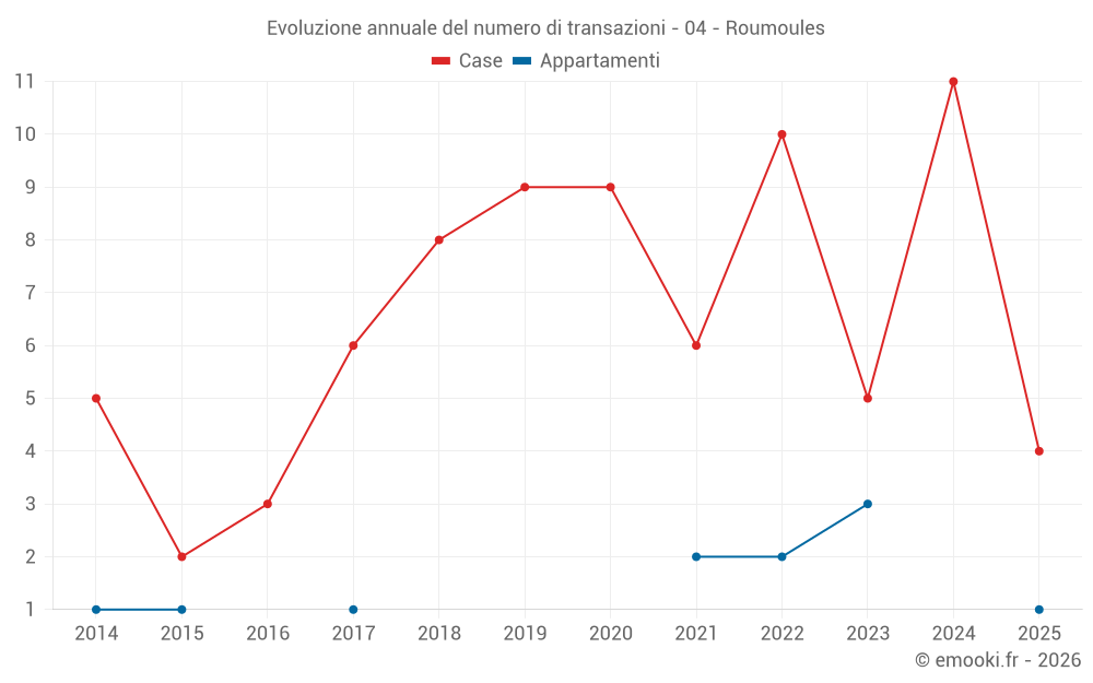 Il prezzo mediano sulle 18 transazioni di case degli ultimi 24 mesi nel comune di Roumoules era di 2 170 € al metro quadrato per un valore patrimoniale mediano di 185 000 €. In questo periodo il 60% delle transazioni era tra 1 520 e 2 413 € al metro quadrato (dal 2° all'8° decile).