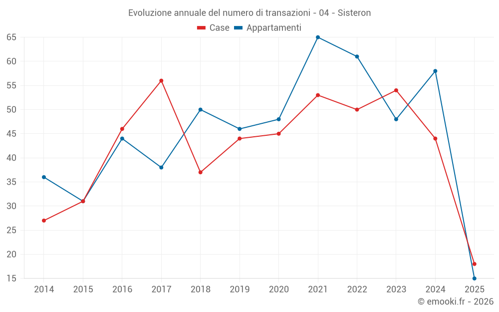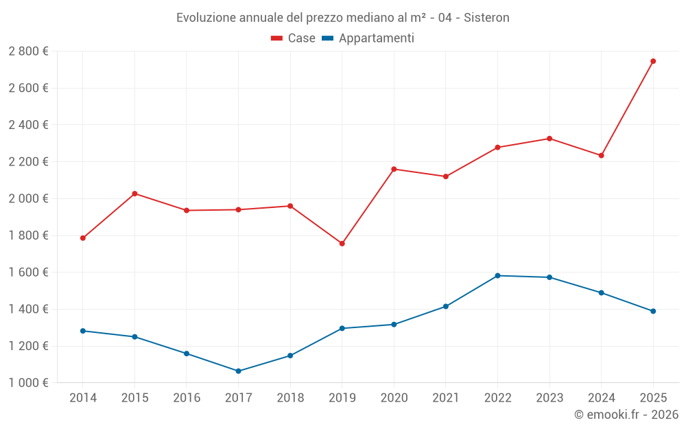 Il prezzo mediano sulle 18 transazioni di case degli ultimi 6 mesi nel comune di Sisteron era di 2 746 € al metro quadrato per un valore patrimoniale mediano di 245 000 €. In questo periodo il 60% delle transazioni era tra 1 361 e 3 045 € al metro quadrato (dal 2° all'8° decile).