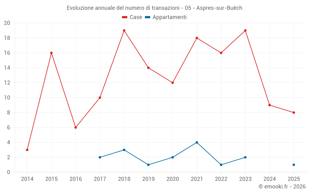 Il prezzo mediano sulle 30 transazioni di case degli ultimi 24 mesi nel comune di Aspres-sur-Buëch era di 1 642 € al metro quadrato per un valore patrimoniale mediano di 129 000 €. In questo periodo il 60% delle transazioni era tra 943 e 2 661 € al metro quadrato (dal 2° all'8° decile).