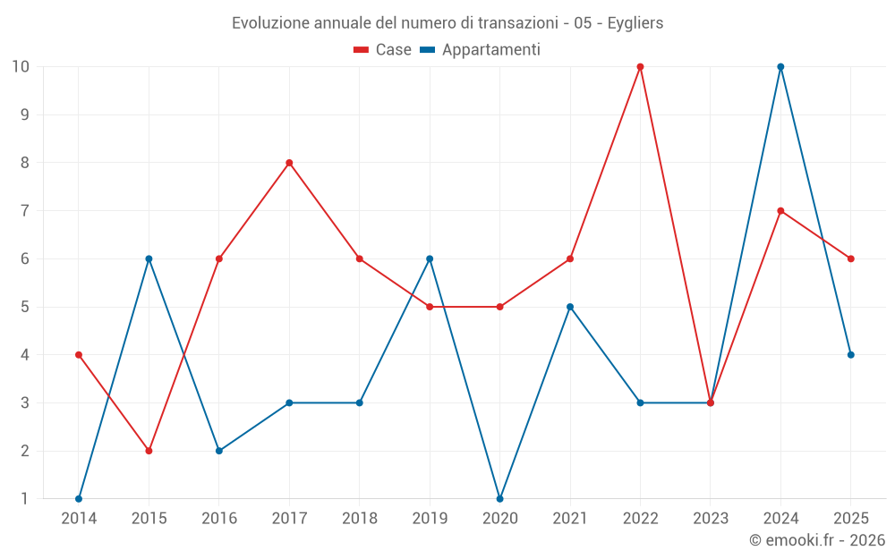 Il prezzo mediano sulle 16 transazioni di appartamenti degli ultimi 24 mesi nel comune di Eygliers era di 2 694 € al metro quadrato per un valore patrimoniale mediano di 162 500 €. In questo periodo il 60% delle transazioni era tra 1 990 e 3 200 € al metro quadrato (dal 2° all'8° decile).