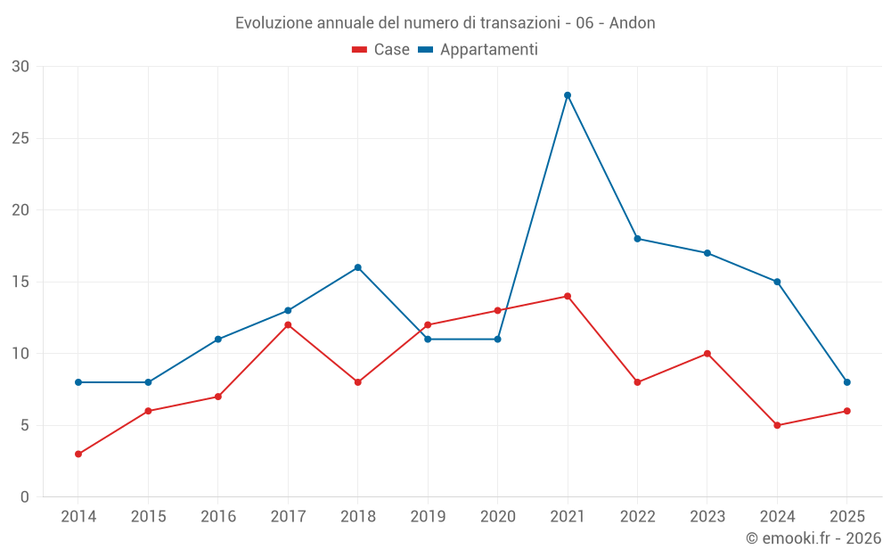 Il prezzo mediano sulle 29 transazioni di appartamenti degli ultimi 24 mesi nel comune di Andon era di 1 435 € al metro quadrato per un valore patrimoniale mediano di 52 000 €. In questo periodo il 60% delle transazioni era tra 1 114 e 1 787 € al metro quadrato (dal 2° all'8° decile).