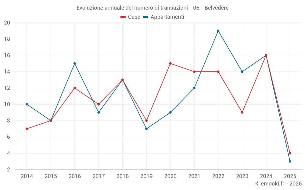 Il prezzo mediano sulle 28 transazioni di appartamenti degli ultimi 24 mesi nel comune di Belvédère era di 1 300 € al metro quadrato per un valore patrimoniale mediano di 59 795 €. In questo periodo il 60% delle transazioni era tra 933 e 2 002 € al metro quadrato (dal 2° all'8° decile).