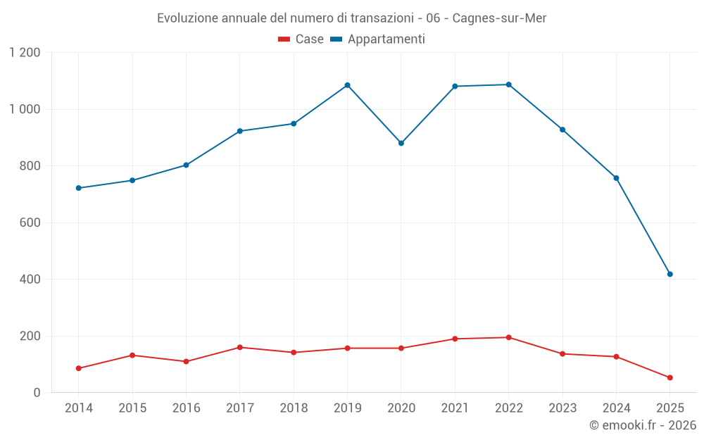 Il prezzo mediano sulle 225 transazioni di appartamenti degli ultimi 3 mesi nel comune di Cagnes-sur-Mer era di 4 655 € al metro quadrato per un valore patrimoniale mediano di 230 000 €. In questo periodo il 60% delle transazioni era tra 3 647 e 5 699 € al metro quadrato (dal 2° all'8° decile).