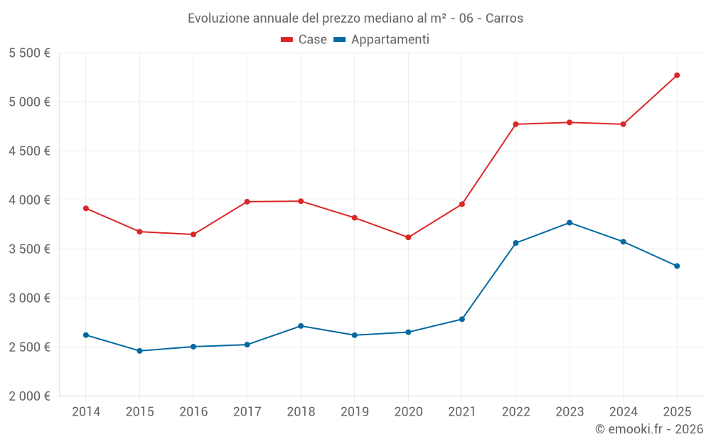 Il prezzo mediano sulle 25 transazioni di appartamenti degli ultimi 3 mesi nel comune di Carros era di 3 783 € al metro quadrato per un valore patrimoniale mediano di 219 000 €. In questo periodo il 60% delle transazioni era tra 2 477 e 5 134 € al metro quadrato (dal 2° all'8° decile).