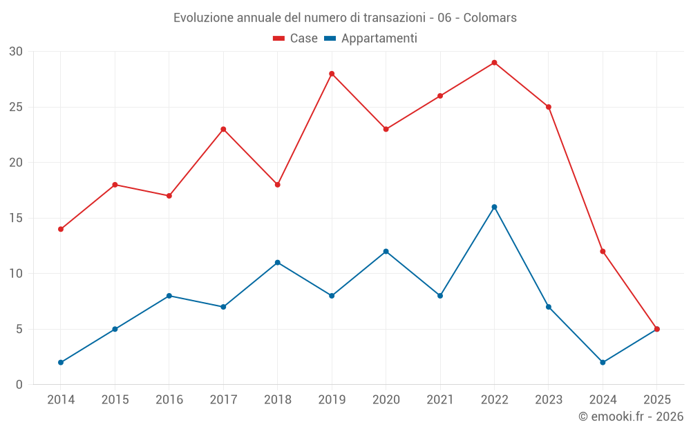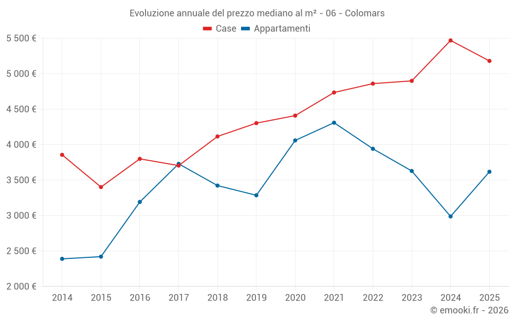Il prezzo mediano sulle 33 transazioni di case degli ultimi 24 mesi nel comune di Colomars era di 4 647 € al metro quadrato per un valore patrimoniale mediano di 480 000 €. In questo periodo il 60% delle transazioni era tra 3 636 e 6 349 € al metro quadrato (dal 2° all'8° decile).