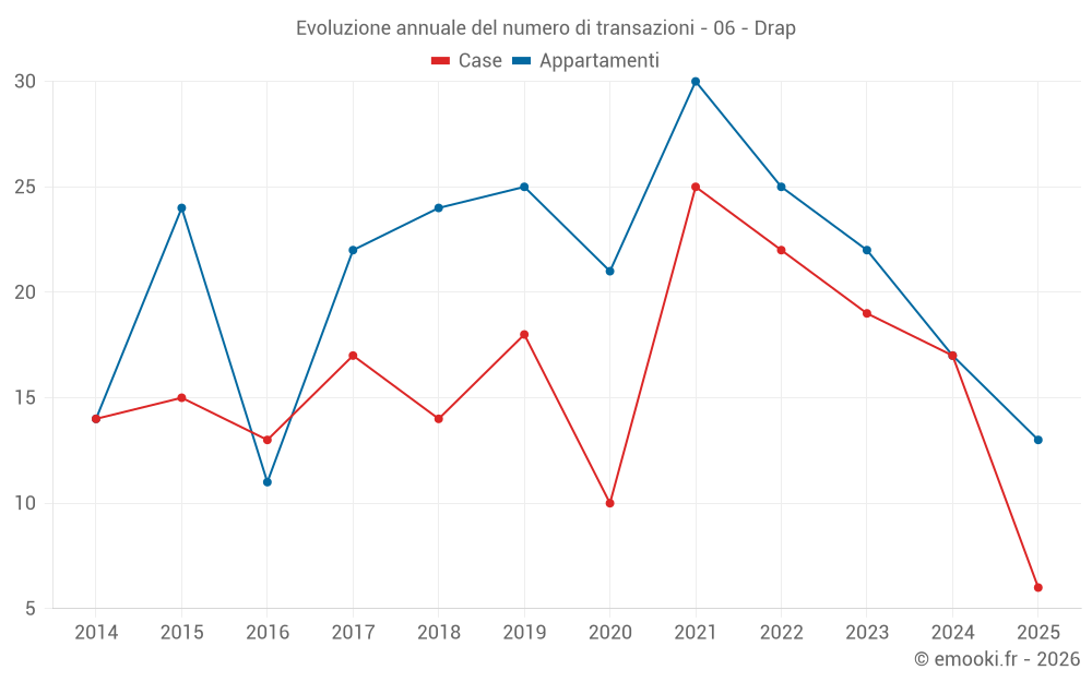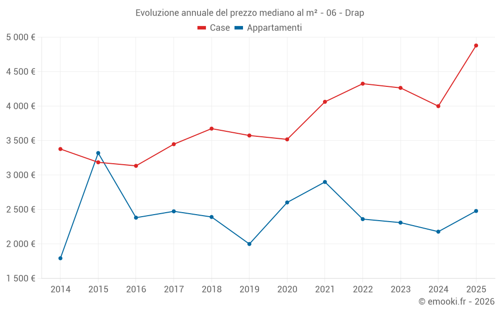 Il prezzo mediano sulle 36 transazioni di case degli ultimi 24 mesi nel comune di Drap era di 4 376 € al metro quadrato per un valore patrimoniale mediano di 419 175 €. In questo periodo il 60% delle transazioni era tra 3 611 e 5 952 € al metro quadrato (dal 2° all'8° decile).