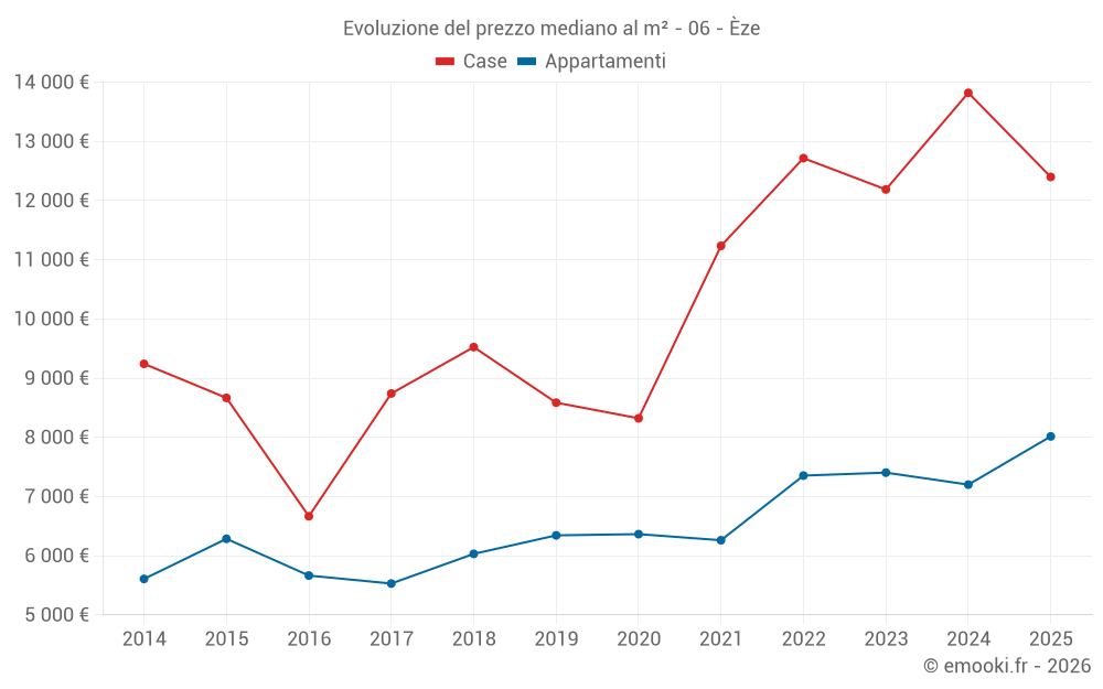 Il prezzo mediano sulle 30 transazioni di appartamenti degli ultimi 12 mesi nel comune di Èze era di 9 214 € al metro quadrato per un valore patrimoniale mediano di 542 150 €. In questo periodo il 60% delle transazioni era tra 6 217 e 13 561 € al metro quadrato (dal 2° all'8° decile).