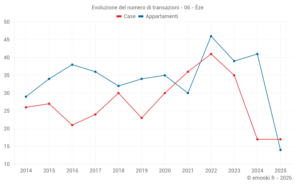 Il prezzo mediano sulle 27 transazioni di case degli ultimi 12 mesi nel comune di Èze era di 12 406 € al metro quadrato per un valore patrimoniale mediano di 1 600 000 €. In questo periodo il 60% delle transazioni era tra 9 459 e 16 503 € al metro quadrato (dal 2° all'8° decile).