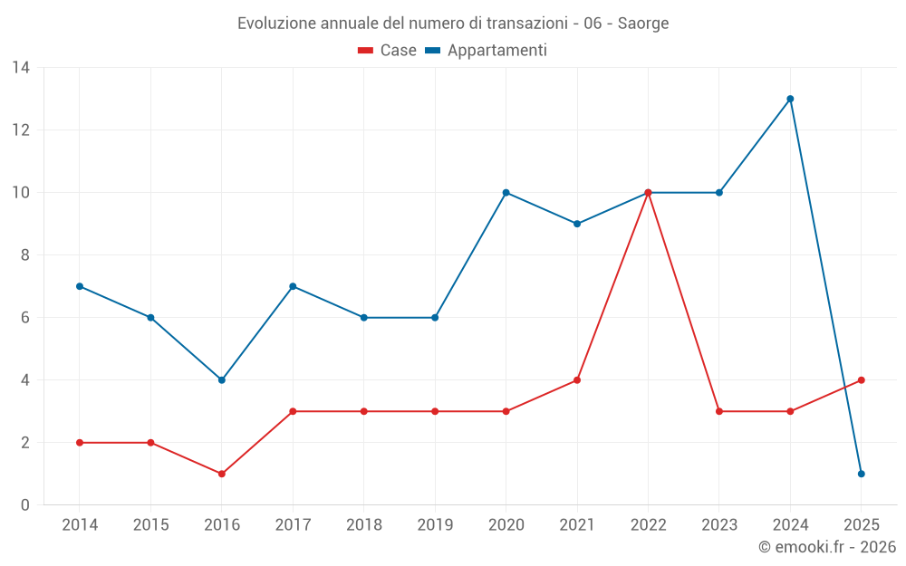 Il prezzo mediano sulle 23 transazioni di appartamenti degli ultimi 24 mesi nel comune di Saorge era di 1 125 € al metro quadrato per un valore patrimoniale mediano di 55 000 €. In questo periodo il 60% delle transazioni era tra 839 e 1 925 € al metro quadrato (dal 2° all'8° decile).