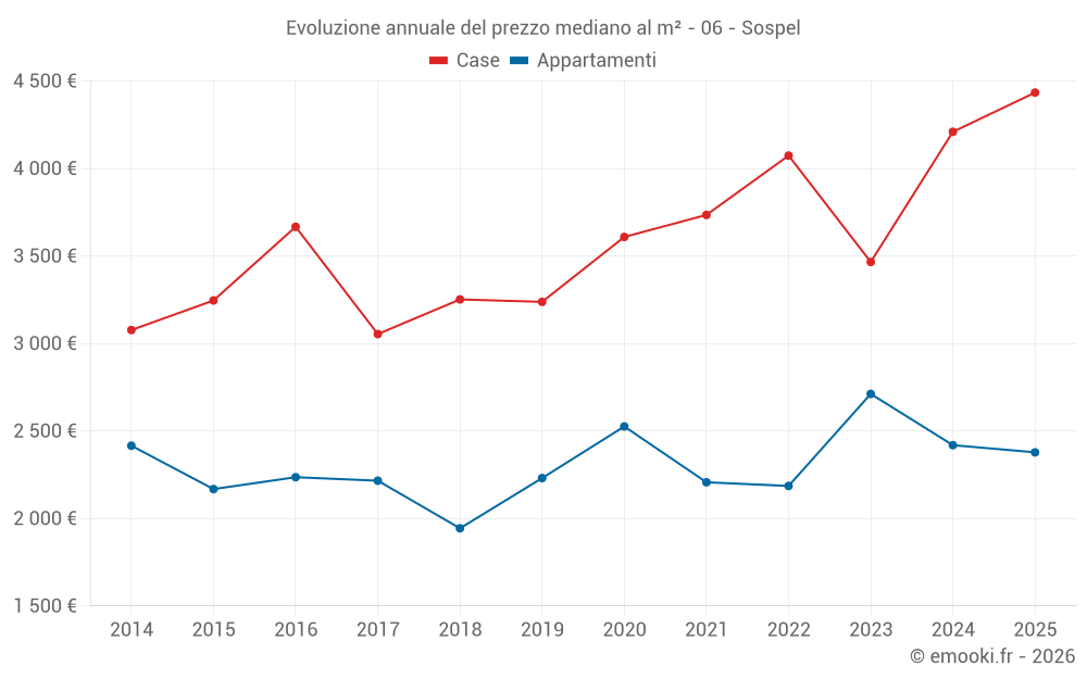 Il prezzo mediano sulle 31 transazioni di case degli ultimi 12 mesi nel comune di Sospel era di 4 398 € al metro quadrato per un valore patrimoniale mediano di 380 000 €. In questo periodo il 60% delle transazioni era tra 3 002 e 4 951 € al metro quadrato (dal 2° all'8° decile).