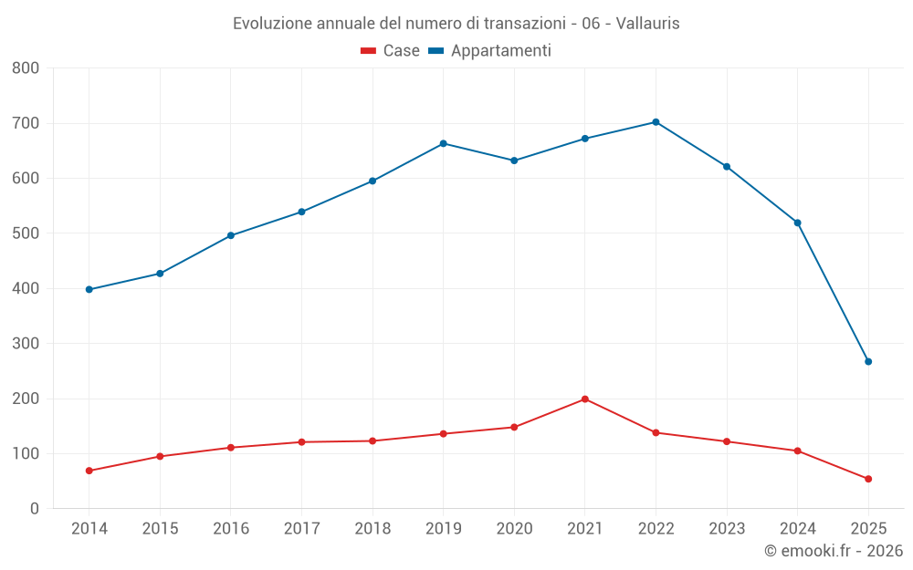 Il prezzo mediano sulle 25 transazioni di case degli ultimi 3 mesi nel comune di Vallauris era di 5 150 € al metro quadrato per un valore patrimoniale mediano di 601 110 €. In questo periodo il 60% delle transazioni era tra 3 424 e 7 172 € al metro quadrato (dal 2° all'8° decile).