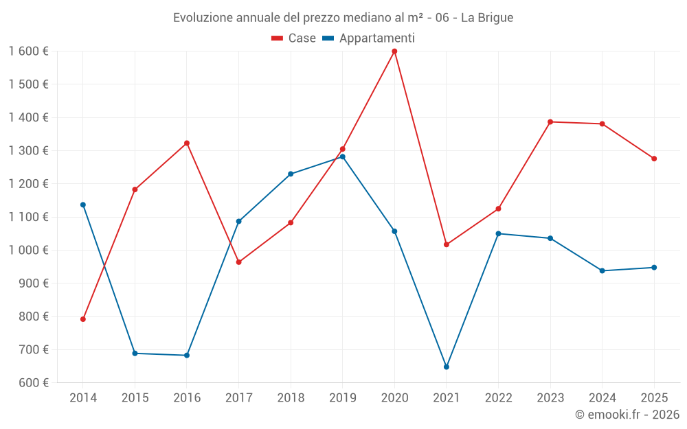 Il prezzo mediano sulle 19 transazioni di appartamenti degli ultimi 24 mesi nel comune di La Brigue era di 996 € al metro quadrato per un valore patrimoniale mediano di 50 000 €. In questo periodo il 60% delle transazioni era tra 842 e 1 436 € al metro quadrato (dal 2° all'8° decile).