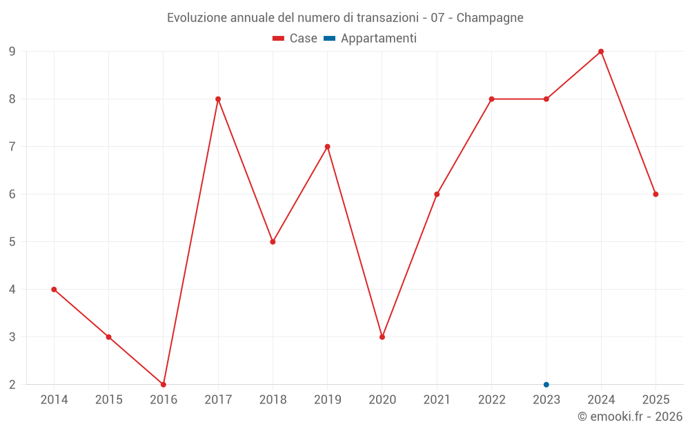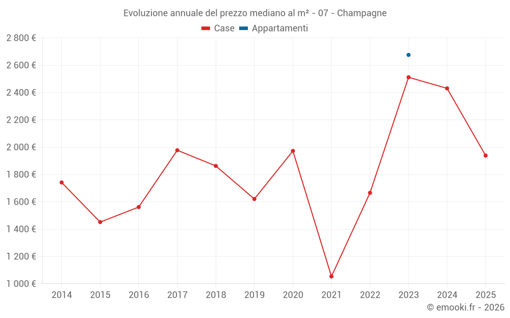 Il prezzo mediano sulle 17 transazioni di case degli ultimi 24 mesi nel comune di Champagne era di 2 431 € al metro quadrato per un valore patrimoniale mediano di 176 200 €. In questo periodo il 60% delle transazioni era tra 1 350 e 2 573 € al metro quadrato (dal 2° all'8° decile).